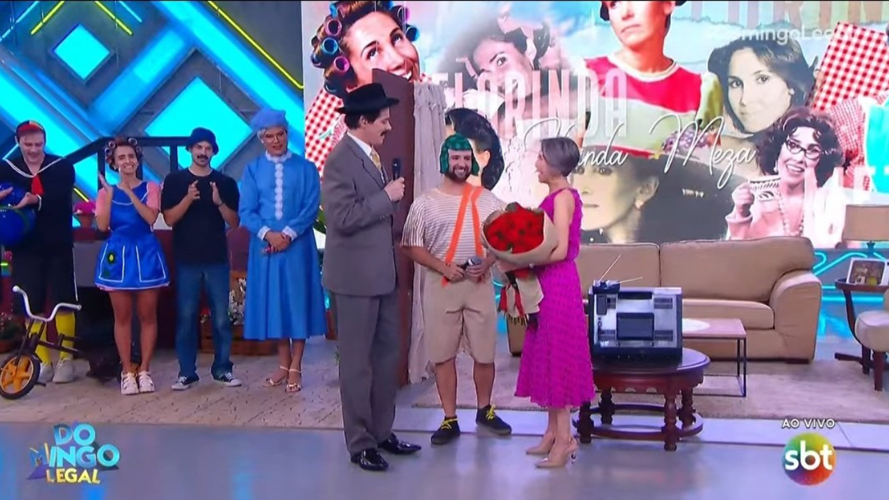 Celso Portiolli recebe Dona Florinda vestido de Professor Girafales; veja